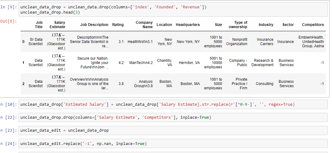 I then decided to drop two additional columns, the ‘Competitors’ column and the ‘ Salary Estimate’ column which we had just cleaned into a new column ‘Estimated Salary’.