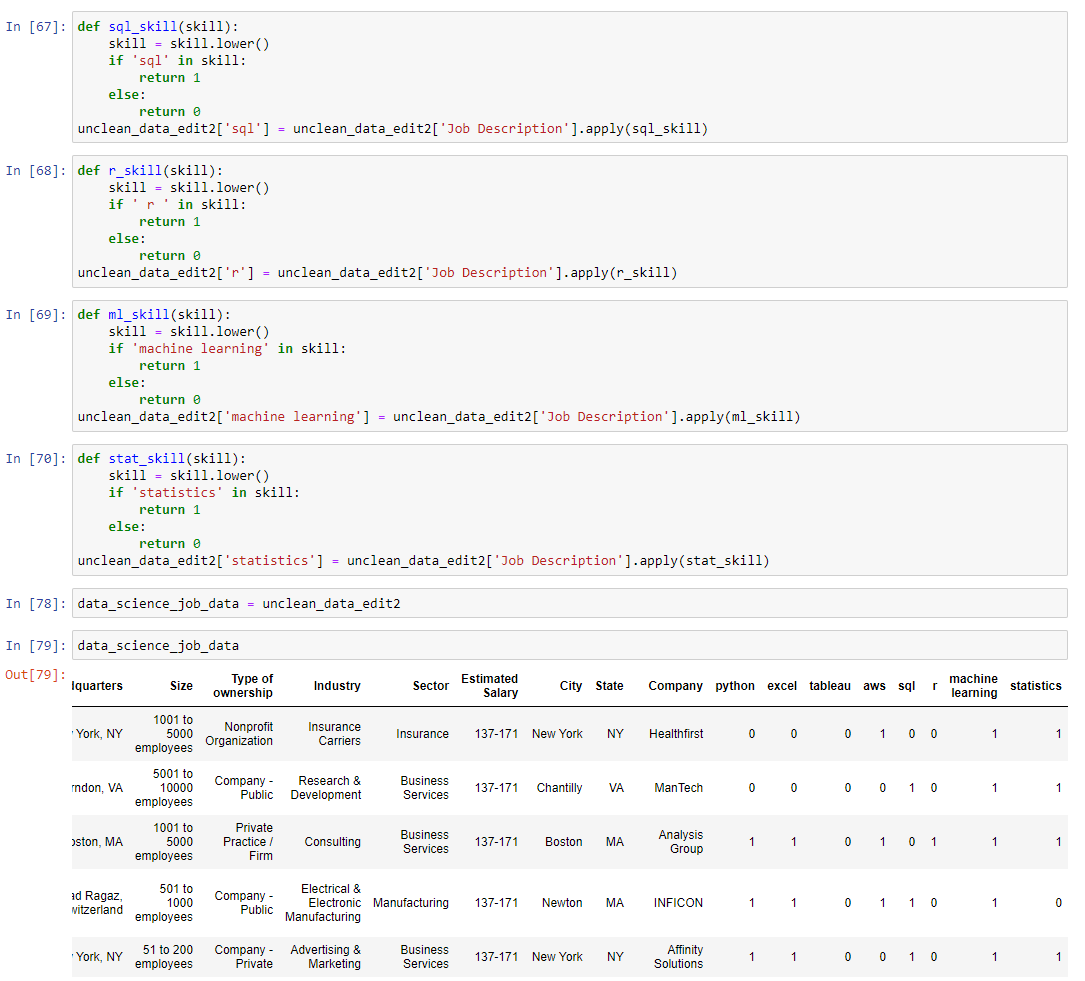 Finally I made a function that would look through the ‘Job Description’ column and return a 1 if it found a key-word. It would return 0 if it did not find that key-word in the description. I did this for every skill I believed could be needed for a data science job. Skills like ‘sql’, ‘python’, ‘machine learning’, and a few more. I then added those to their own columns at the end.