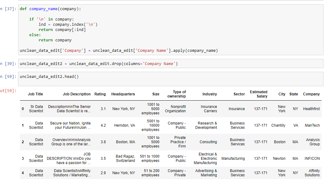 Here I decided to clean up the ‘Company Name’ Column. The column had the name of the column, followed by its rating. I wanted to remove the rating to just have the name. To do this I found the index of the characters ‘/n’ that came before the rating. I then returned the string up until that index.