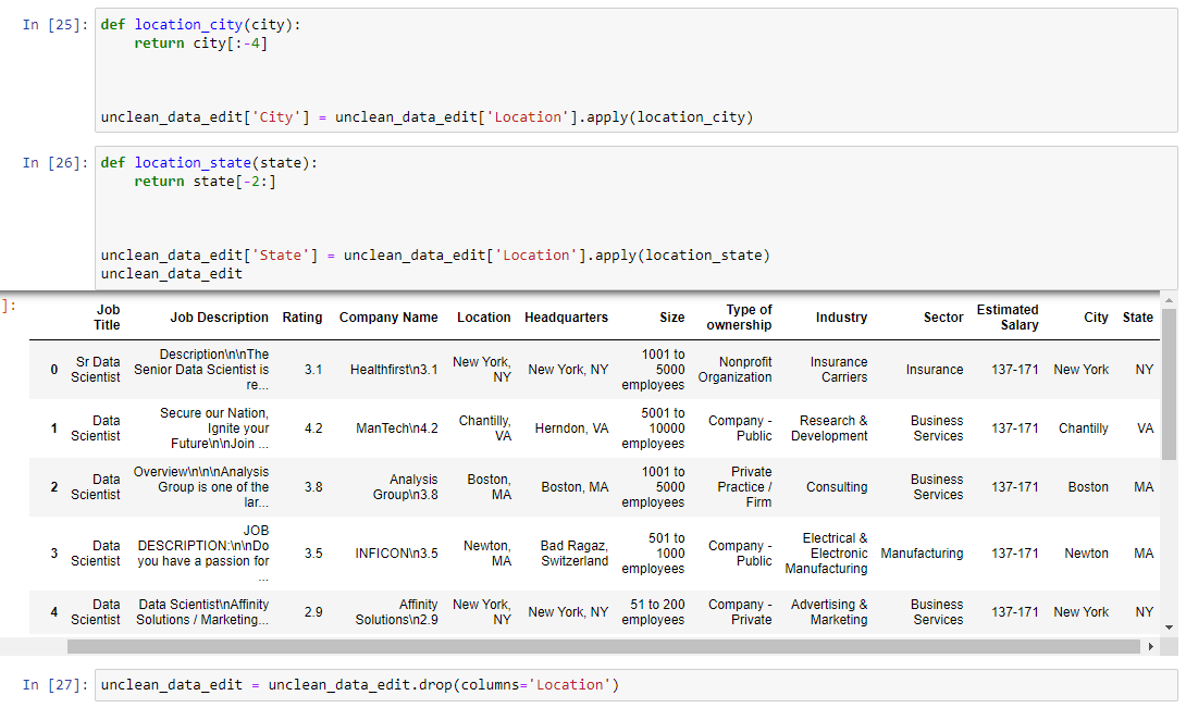 Here I made two functions, one would pull the city from the ‘location’ column, and the other would pull the state from the ‘location’ column. I then assigned these to two new columns titled ‘City’ and ‘State’